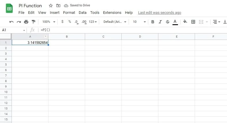 La funzione PI in Fogli Google restituisce il valore di PI fino a 9 numeri decimali. Questo è pari a 3,141592654. Quando si utilizza la funzione PI, non ci si rende conto di alcun argomento alla formula. Questo perché il valore di PI è predefinito e non viene calcolato. Ecco il modo più semplice per scrivere PI in Fogli Google:
